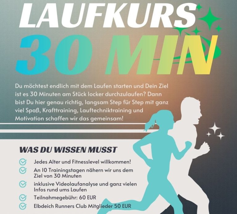Auch in 2026 wird wieder ein neuer Anfängerlaufkurs stattfinden. Immer Dienstag trainieren wir gemeinsam, um am Ende 30 Minuten am Stück durchlaufen zu können. Wenn Du also lange nicht gelaufen bist oder ganz von Null anfängst, dann ist dieser Kurs genau richtig für Dich.