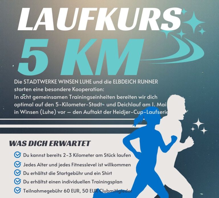 In acht gemeinsamen Trainingseinheiten bereiten wir dich optimal auf den 5‑Kilometer‑Stadt- und Deichlauf am 1. Mai in Winsen (Luhe) vor – den Auftakt der Heidjer‑Cup‑Laufserie. Du kannst natürlich auch teilnehmen, auch wenn Du nicht beim 1. Mai Lauf starten möchtest/ dabei sein kannst.