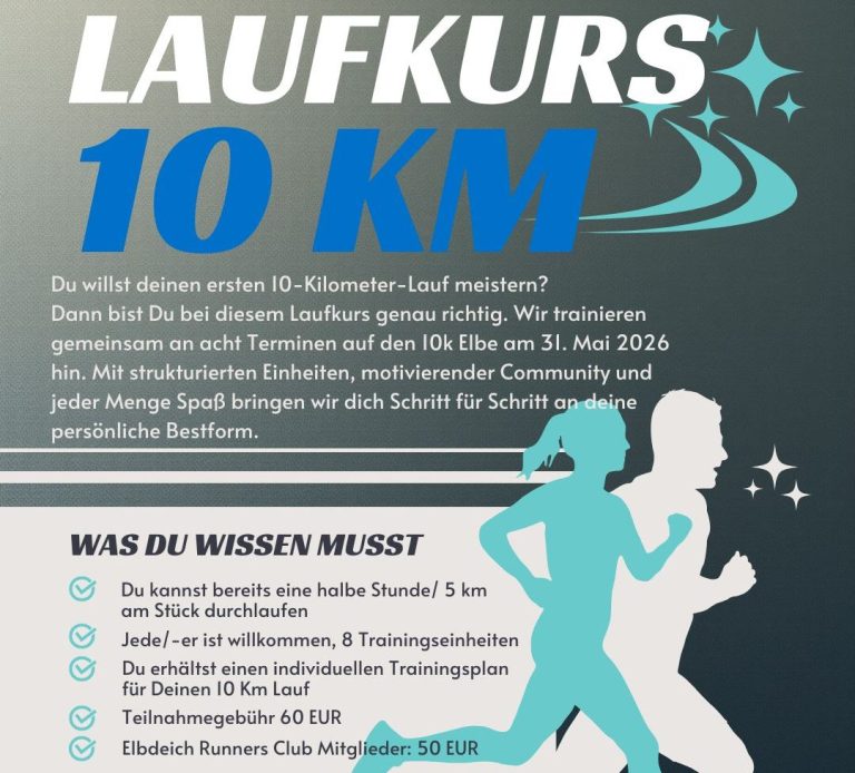 Dann bist Du bei diesem Laufkurs genau richtig. Wir trainieren gemeinsam an acht Terminen auf den 10k Elbe am 31. Mai 2026 hin. Mit strukturierten Einheiten, motivierender Community und jeder Menge Spaß bringen wir dich Schritt für Schritt an deine persönliche Bestform. Du kannst natürlich auch teilnehmen, auch wenn Du nicht beim 10k Elbe Lauf mit dabei sein kannst/ möchtest.